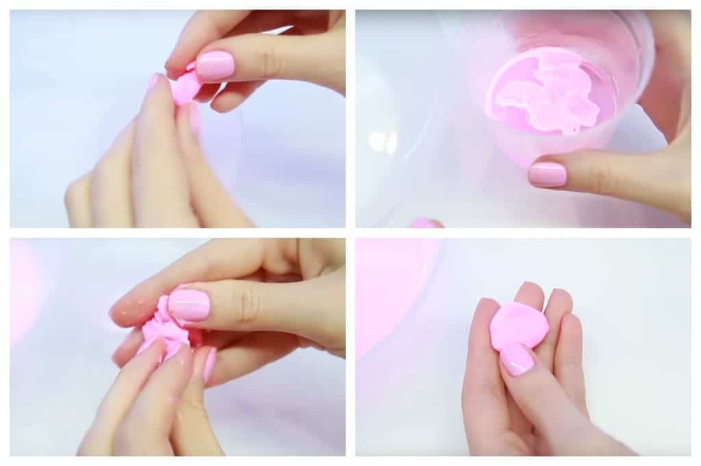 - Возьмите подсохшую часть, положите в емкость и залейте горячей водой, оставив на 3 мин. Периодически двигайте кусочек в воде.