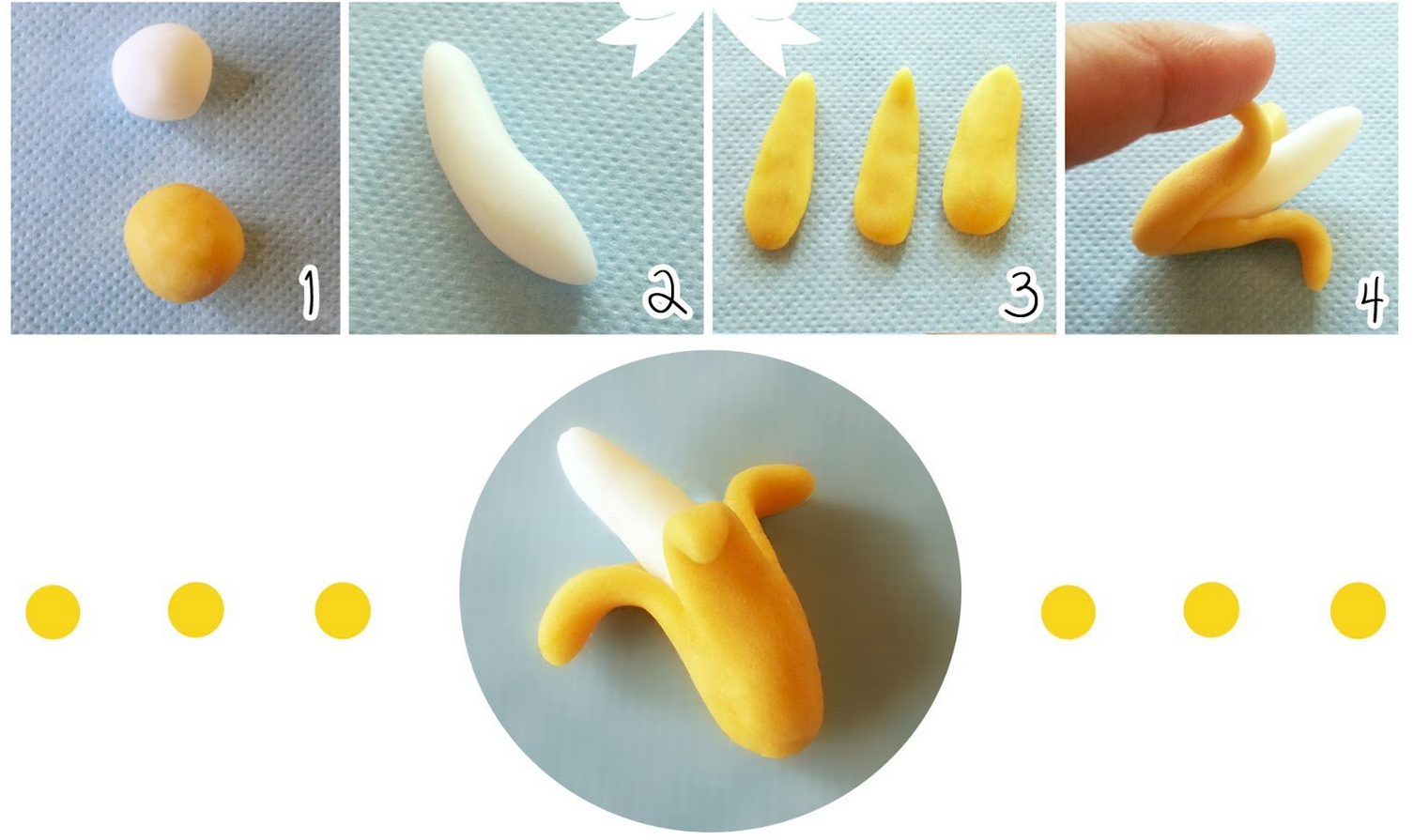Смешайте один к четырем желтый и белый, скатайте небольшую колбаску с мягкими кончиками, сделайте из желтого цвета три лепестка кожуры. Прикрепите по сторонам и смажьте места соединения.