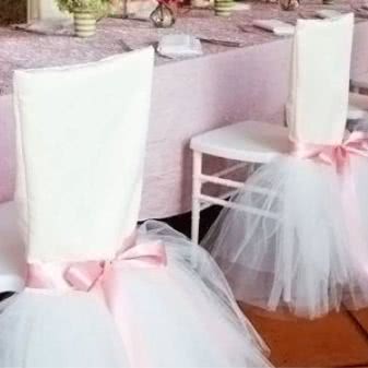 Любое празднование практически всегда предполагает угощения. Вечеринка может проходить стандартно, с приглашением за стол, который вместе со стульями стоит нарядить в едином стиле с остальными декорациями. Красиво смотрятся «юбочки» из ткани, украшенные лентами, завязанными бантом.