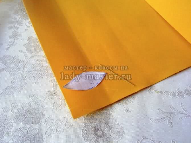 Из бумаги делаем шаблон лепесточка подсолнуха. Так как этот цветок мы делаем на украшение для волос, то лепестки, как и сам подсолнух, не должны быть большими. Размер лепестка по длине равен 3,5 см и по ширине — 1,7 см.