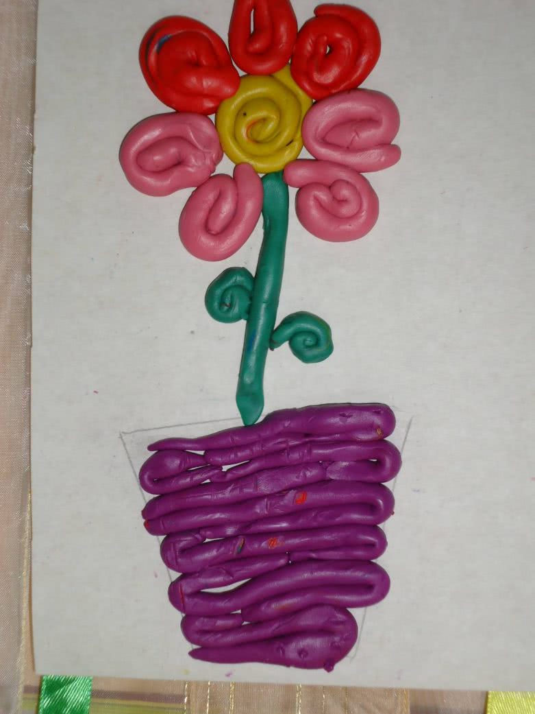 - Вырезаем из цветного картона вазочку и украшаем ее пластилиновым бантом;