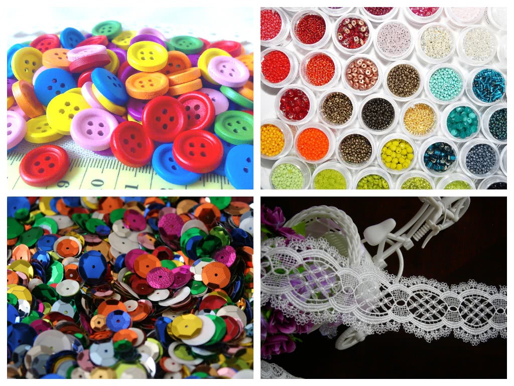 - Бусинки, бисер, пайетки, стразы, шарики, пуговицы, кружева. Вся фурнитура нужна для украшения. Этот набор зависит от фантазии рукодельницы.