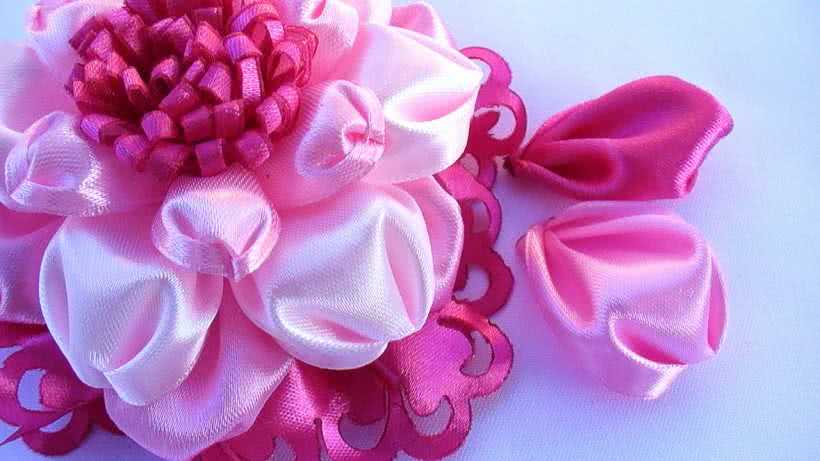 Для создания пышного бутона розы лучше взять атласную ленту, она изумительно выглядит на изгибах, имитируя нежные линии лепестков. Новичков следует предупредить, что работать с атласом сложно, он скользит и труднее сгибается, но результат получается потрясающим.