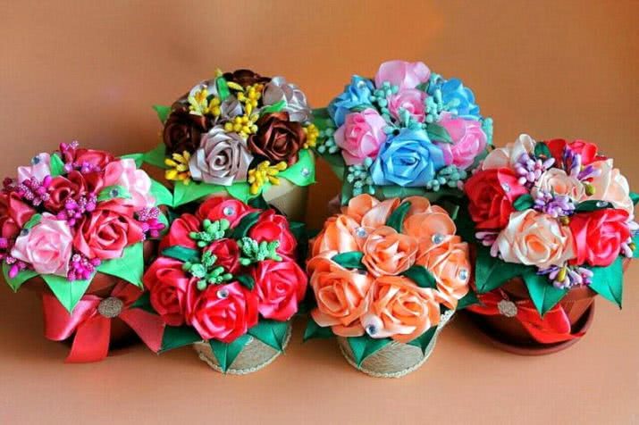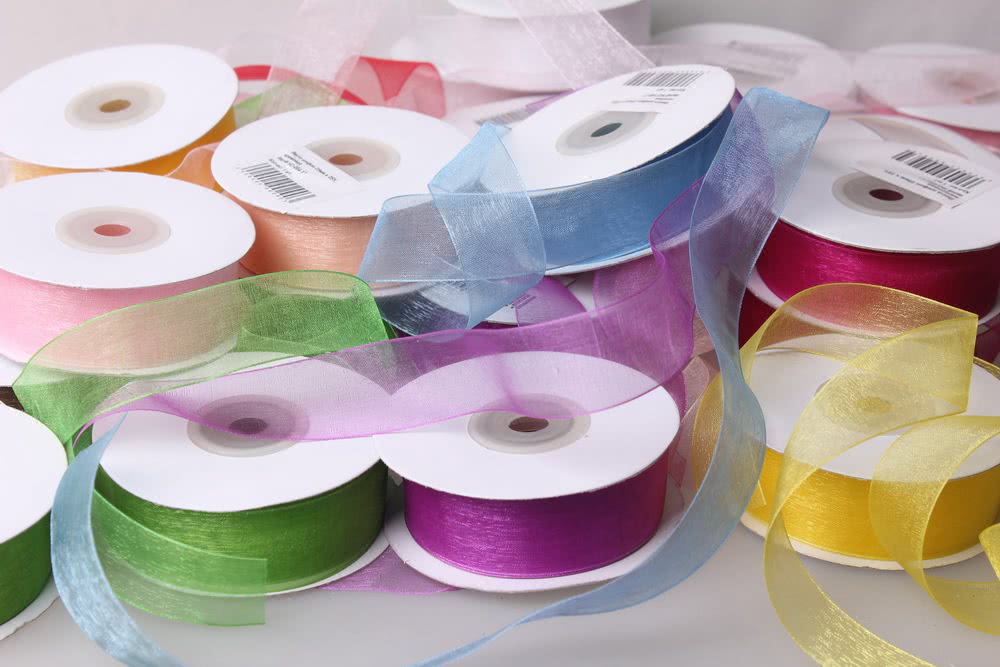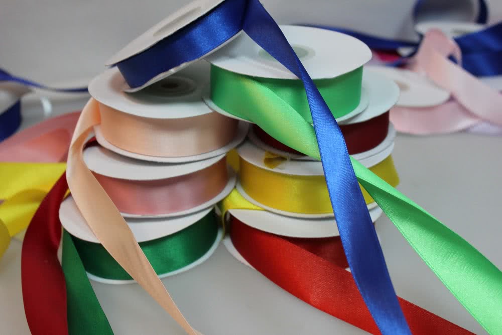 Чаще всего делают такие украшения из атласной ленты. Этот материал приятен на ощупь, податлив, его просто резать, а края легко обрабатывать. После проведения манипуляций с лепестками изделие не меняет своей формы и не деформируется. Для разных цветов могут понадобиться ленточки разной ширины – от 1 см до 5 см. Рекомендуется начинать с 5 см, с такими удобнее работать. Широкий выбор цветов позволяет воплотить из атласа любые фантазии. Причем работать можно не только с однотонными лентами.