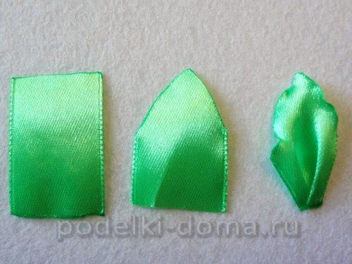 - Прежде всего, нужно взять отрезки атласной лент зеленого цвета, сложить пополам и разделить паяльником по диагонали, как это показано на фото. Развернуть полученные заготовки. Получатся изделия закрытого и открытого типа.