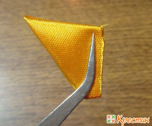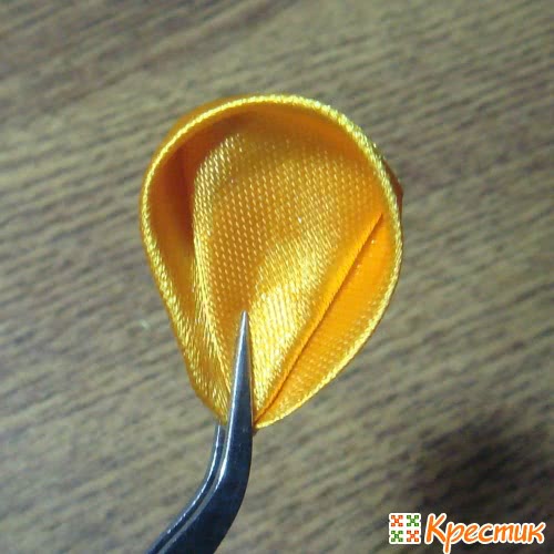 Для начала нужно сложить квадратики из ленты по диагонали, а потом подогнуть уголки. Чтобы полученная заготовка не расползалась, ее придерживают пинцетом. Нижний край нужно обрезать и опалить. После этого боковые уголки загнуть назад и закрепить. Получится объемный лепесток круглой формы.