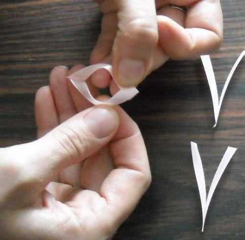 - Взять кусочки розовой или белой ленты прямоугольной формы. Длина их должна быть примерно вдвое больше ширины.