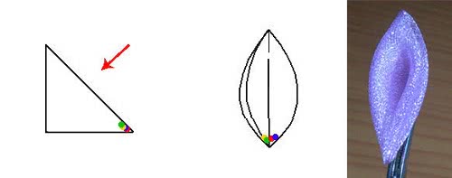 Легче всего в технике канзаши сделать простой острый лепесток. Для этого нужен кусочек ленты размером 5 х 5 см с оплавленными краями, чтобы нитки не высыпались. Его нужно свернуть по диагонали два раза, придерживая пинцетом. Если срезать уголок и основание полученного треугольника, образуется лепесток, но обязательно нужно опалить линию среза.