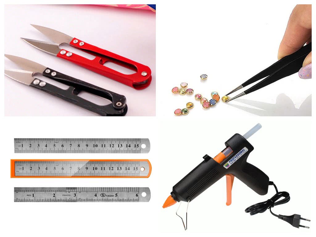 - Клей. Желателен прозрачный, чтобы не испортить внешний вид готового изделия. Приклеиваются не только лепестки цветков, но и декоративные элементы: бусины, стразы. Подойдет прозрачный «Момент» или пистолет с горячим клеем.