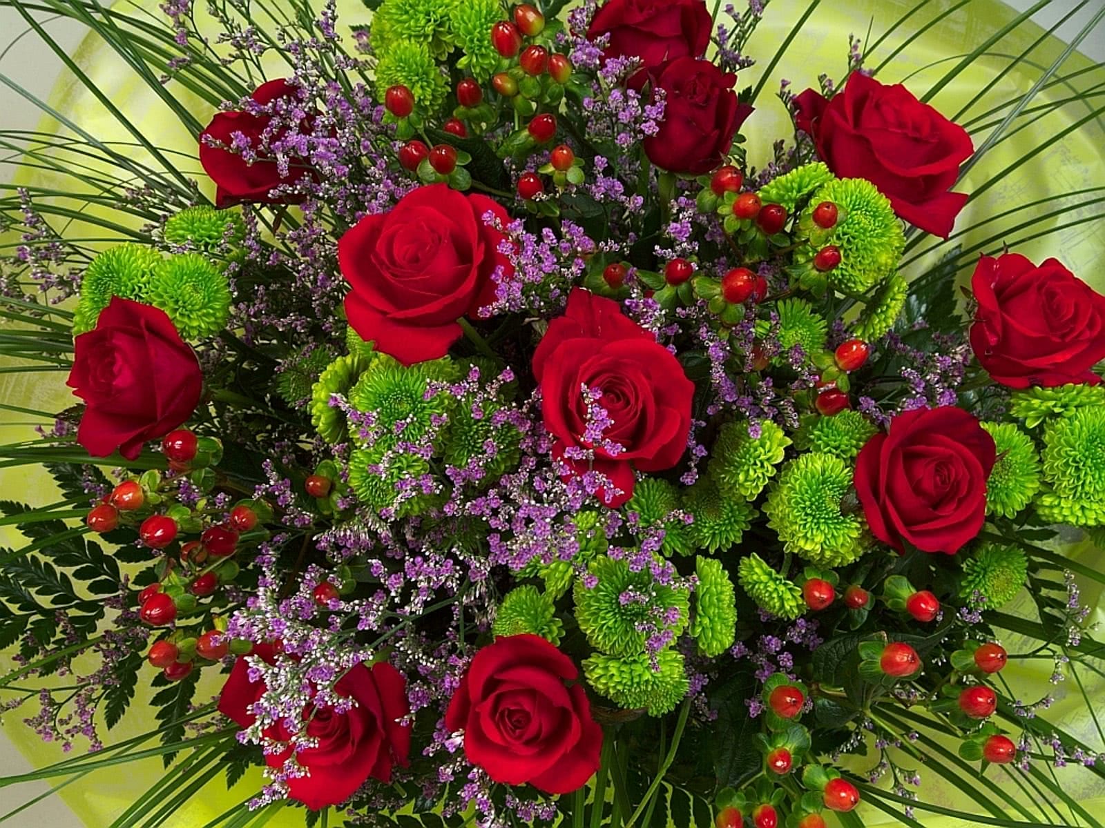 Красивые красные розы выделяются из ярко-зеленого фона этого красивого букета
