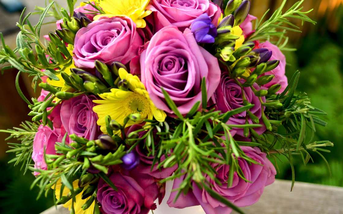 Огромная фотография красивого бело-фиолетового букета цветов. Она отлично подойдёт для установки на рабочий стол