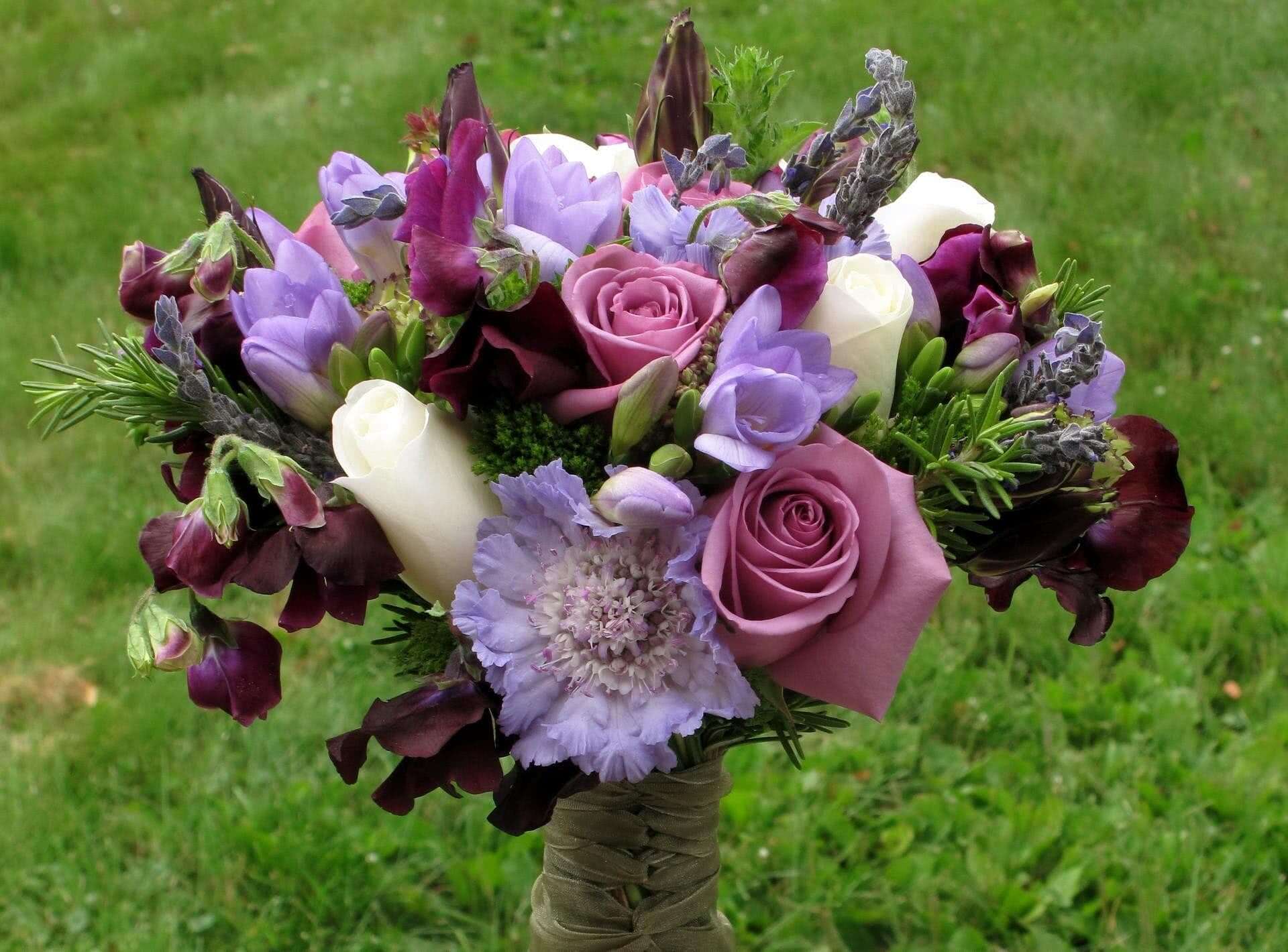 Бело-фиолетовый букет на траве. Он связан зелёной тканью, которая отлично гармонирует с травой и стеблями цветов