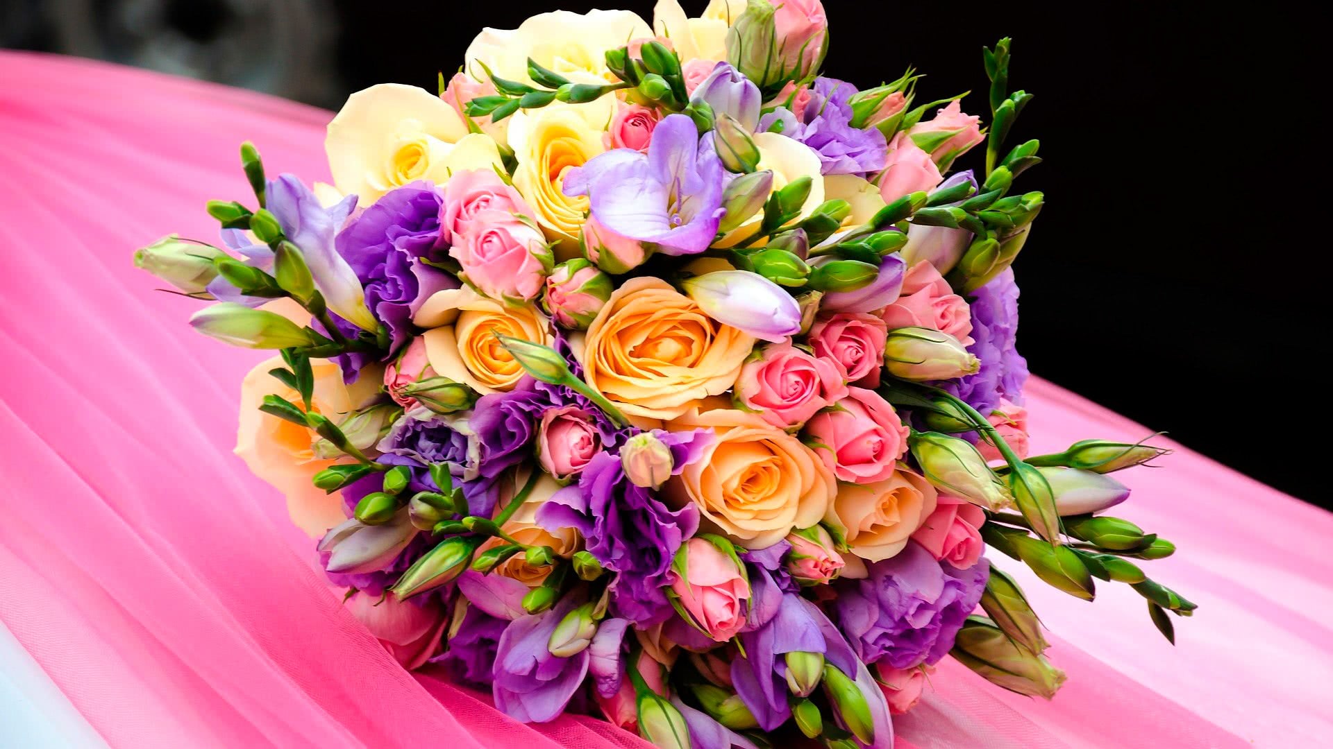 Очень красивый букет роз, тюльпанов и других цветов на розовой легкой ткани