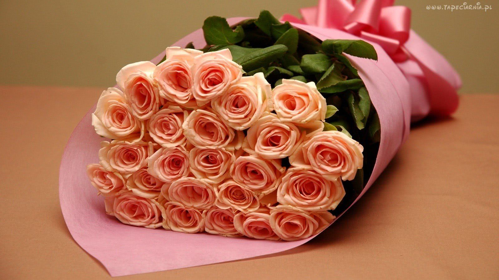 Просто шикарный букет роз нежно-розового цвета в обёртке с бантиком лежат на столе