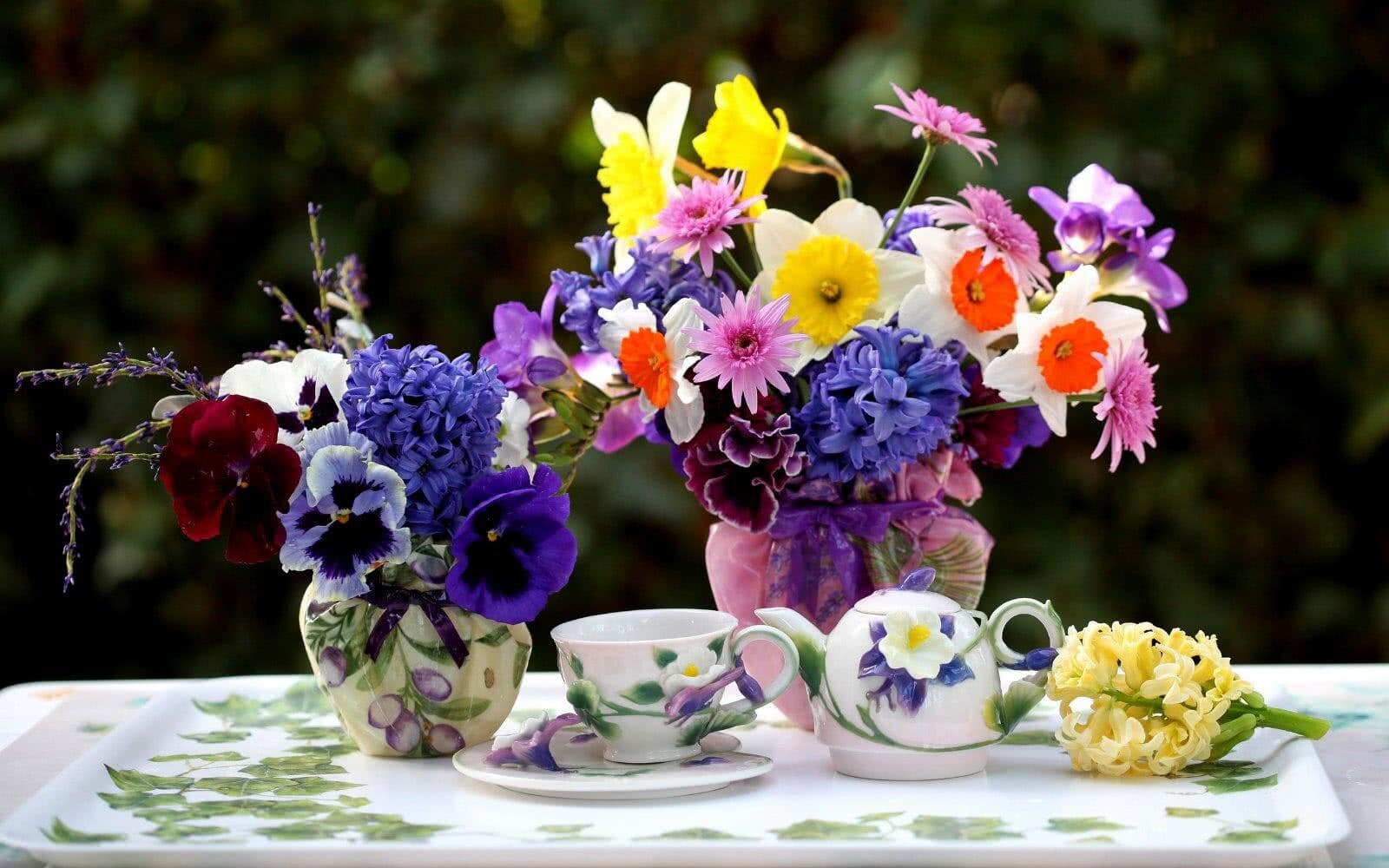 Две вазы с прекрасными цветами украшают чье-то чаепитие