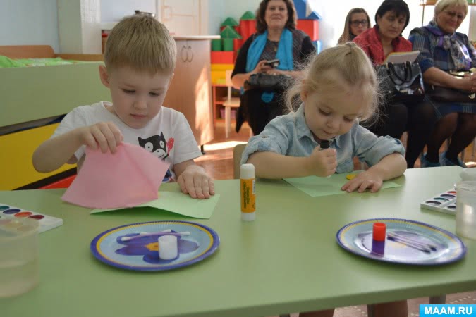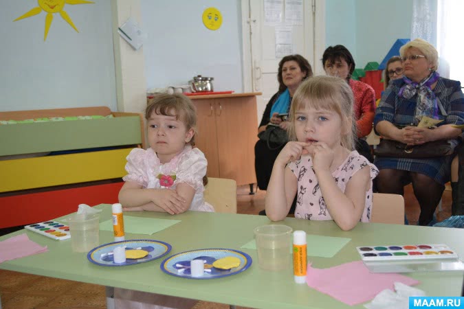 — Ребятки, проходите к столам, садитесь. Сейчас мы с вами будем делать аппликацию «Цыплятки на лугу». Внимательно смотрите и запоминайте как мы будем ее делать.