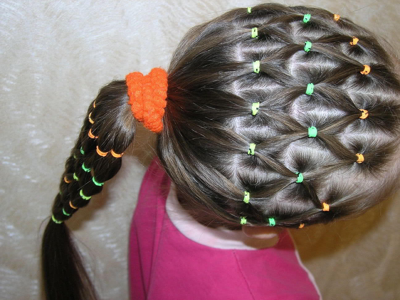 Завершающий процесс создания этой прически чрезвычайно прост. Нужно получившийся хвост по всей его длине несколько раз перехватить разноцветными резиночками. Получится некое подобие косы без плетения. Прическа очень простая, но красивая и удобная для девочки. Однако следует учесть, что сделать ее на короткие волосы не получится.