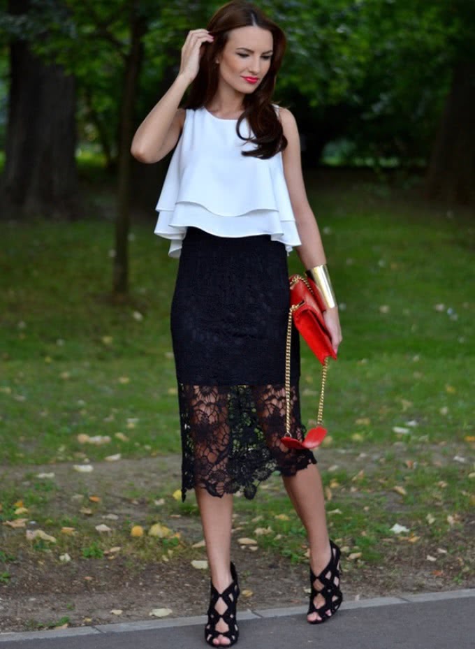 Поэтому если вы купили красную или черную юбку карандаш, тогда обязательно закажите под нее туфли или ботильоны на тонком каблуке. Такая модель очень сильно любит аксессуары, по этой причине будет лучше если вы дополните весенний лук с юбкой замшевой сумочкой на цепочке, оригинальными бусами и сережками или просто ярким шарфиком.