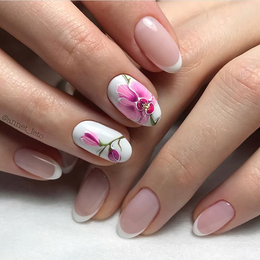 Крупные, яркие цветы – то, что нужно в весенне-летнем сезоне. Причем они могут быть в тон основному покрытию или же выступать в качестве акцента в маникюре. В любом случае французский маникюр с цветами придает образу особую элегантность.