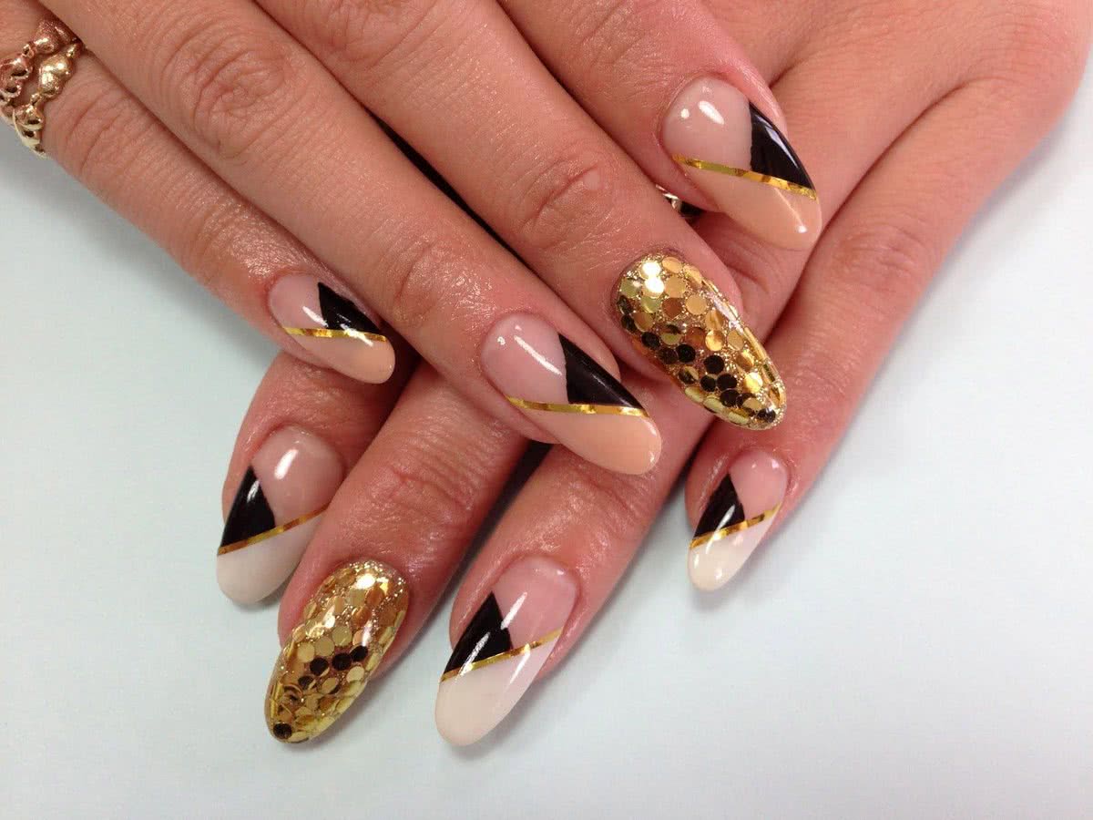 В черном цвете отлично смотрится геометрический декор. Глиттер используется для прорисовки отдельных зон на узоре, для сплошного покрытия ногтей. Присмотритесь к французскому маникюру с серебряным или золотым глиттером по краю ногтевой пластины. Визуально блестящая “улыбка” френча будет удлинять ноготки, делать маникюр эффектнее и благороднее.