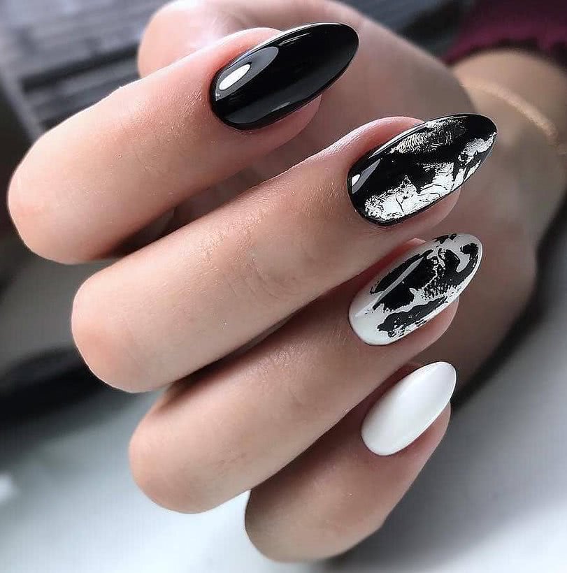 Нестандартный нейл-дизайн с узором и фольгой.
