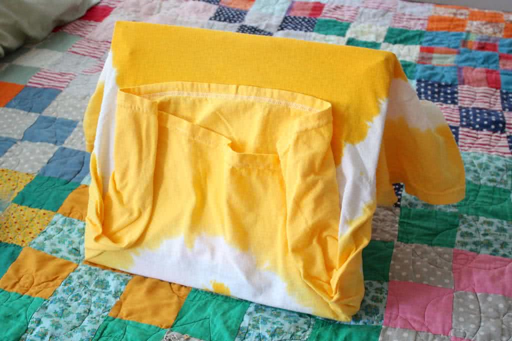 Обтягиваем каркас футболкой, складывая её так, как показано на фото ниже. Футболка должна быть натянута достаточно плотно.
