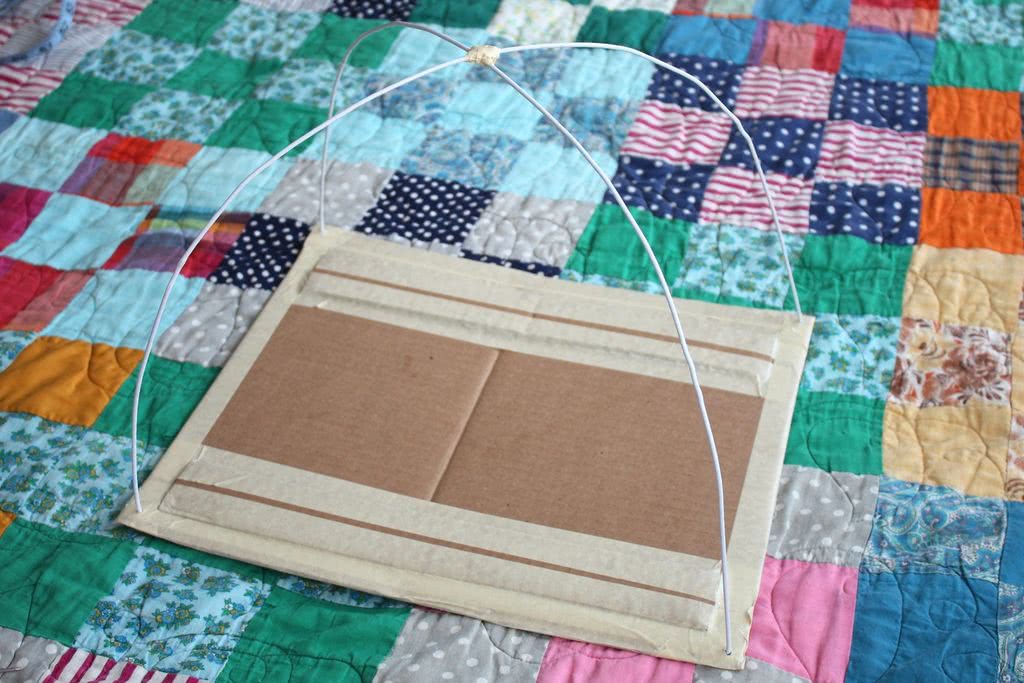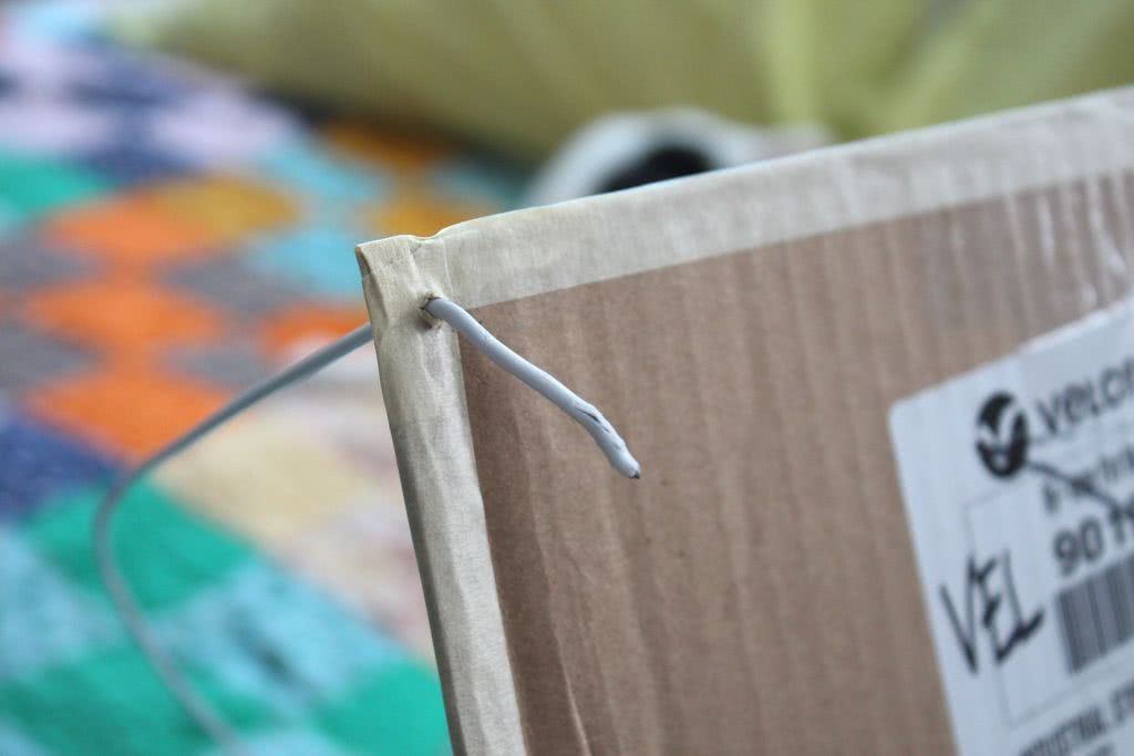 Скрещиваем проволоки и закрепляем верхушку скотчем. Проверьте, чтобы ножки стойки касались углов картона. Вставьте их в отверстия.