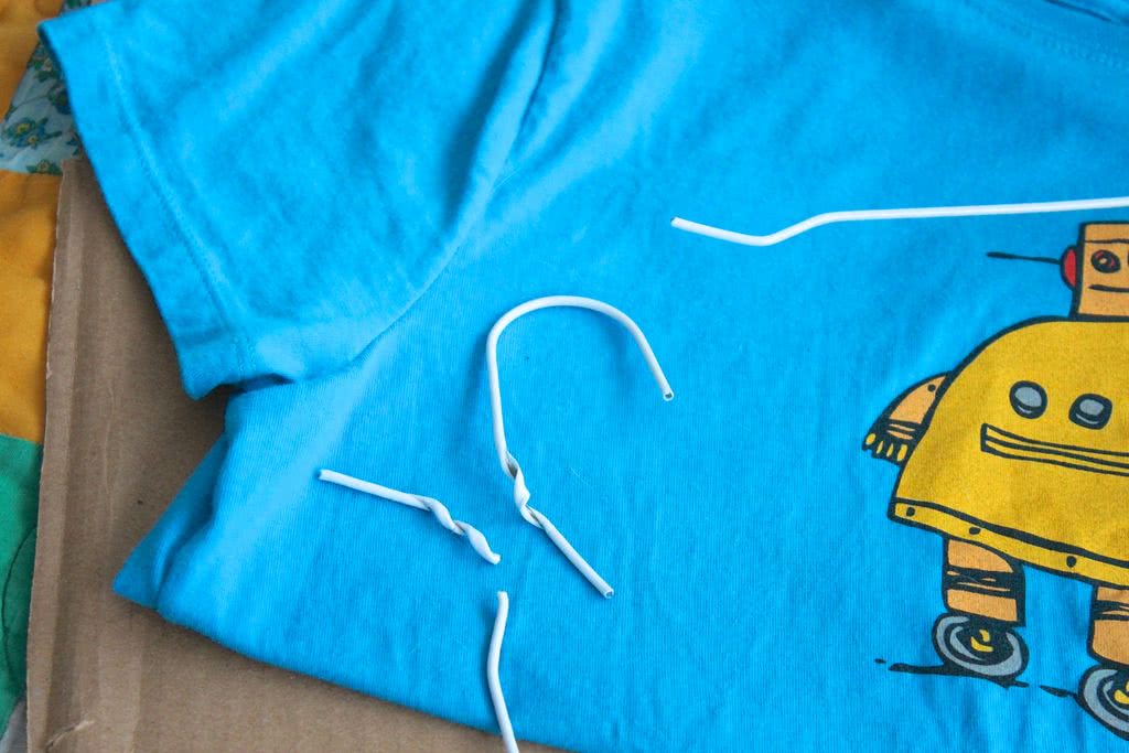 Итак, приготовьте: футболку, плотный квадратный картон, две проволочные вешалки, клейкую ленту, булавки, плоскогубцы.