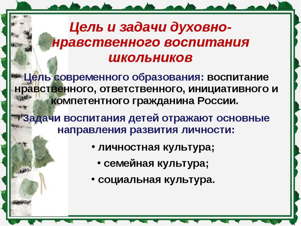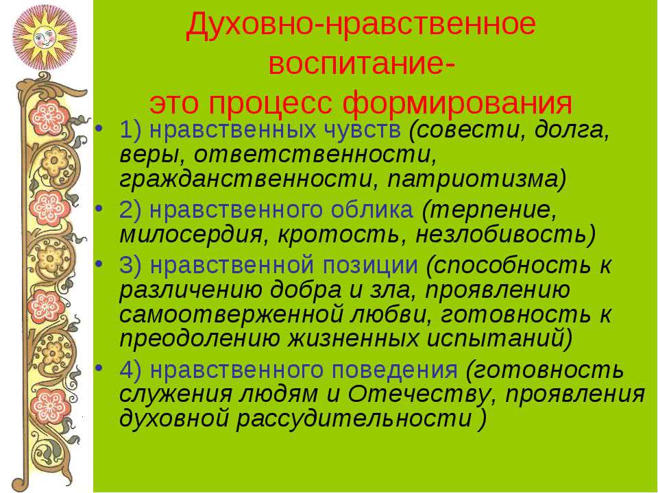 Результатом выполнения всех этих задач и достижения целей духовно-нравственного воспитания должны стать личные качества, которые помогут ребёнку жить трудится в современном обществе. Полноценный член общества обладает волей, целеустремлённостью настойчивостью, самоконтролем, самостоятельностью. Он трудолюбив, способен объективно оценивать свои действия, намерения, мысли, преодолевать любые трудные обстоятельства и принимать трезвые решения. Такой человек осознаёт свою обязанность руководствоваться во всех своих поступках совестью.