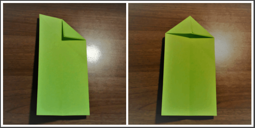 - Загните в верхней части листа два угла внутрь, чтобы они сошлись по центру. Один уголок будет двойным, второй — одинарным.