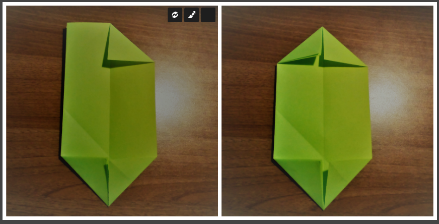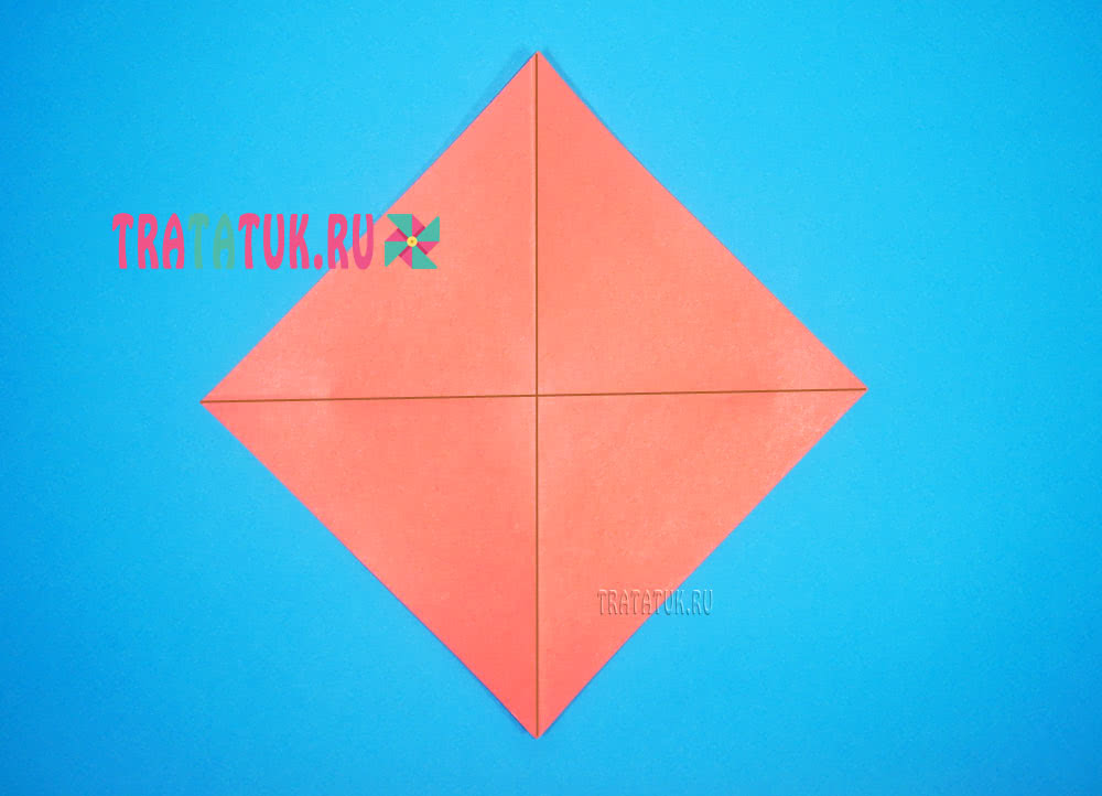 - Перевернуть квадрат. На этой стороне углы квадрата будут представлять собой ромбы, каждый из которых разделён на 2 треугольника по диагонали. Раскрыть 2 противоположных ромба.
