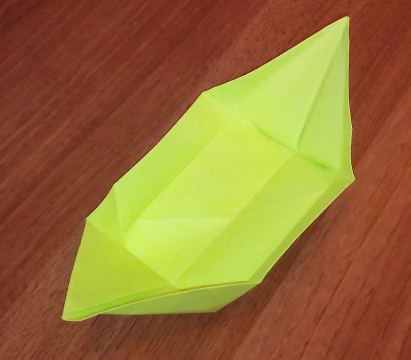 - Сложить корабль по сгибам: диагональный центральный сгиб направить вверх, боковые сгибы направляются вниз, полосы при этом становятся бортами корабля. Верхний угол можно загнуть внутрь.