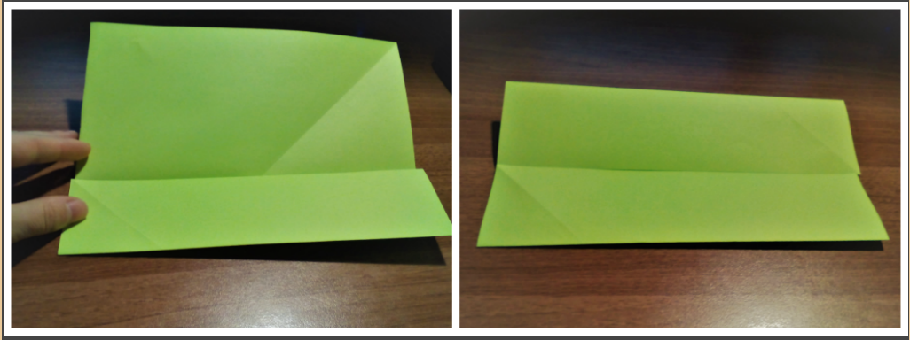 - Верхнюю часть разогните и сделайте ещё один сгиб, притянув верхнюю линию к нижней. Таким образом, у вас получится сгиб по горизонтали.