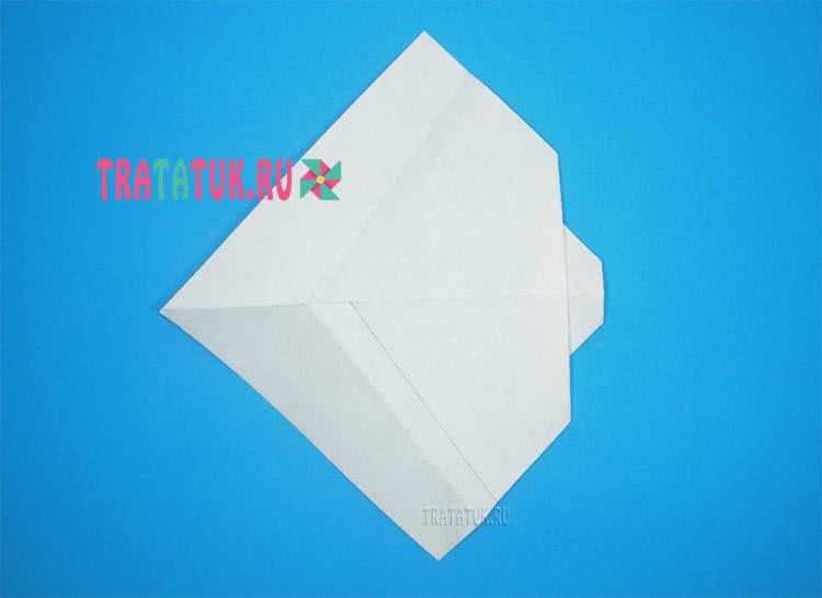 Свободный левый угол загните к центру и получится раскрытый конверт. Этот край отогните в сторону. Загибаем этот угол внутрь корабля.