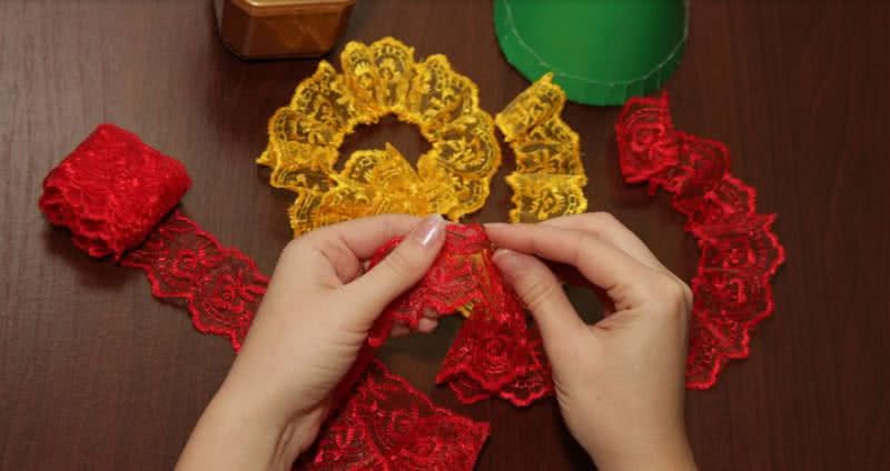 7. Из кружева сделайте юбчонку, соберите при помощи иголки с ниткой, чтобы она получилась воздушной и пышной.