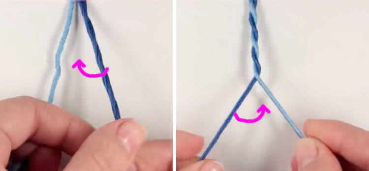 - разделите свободные концы нитей на две части: старайтесь, чтобы они были одинаковыми;