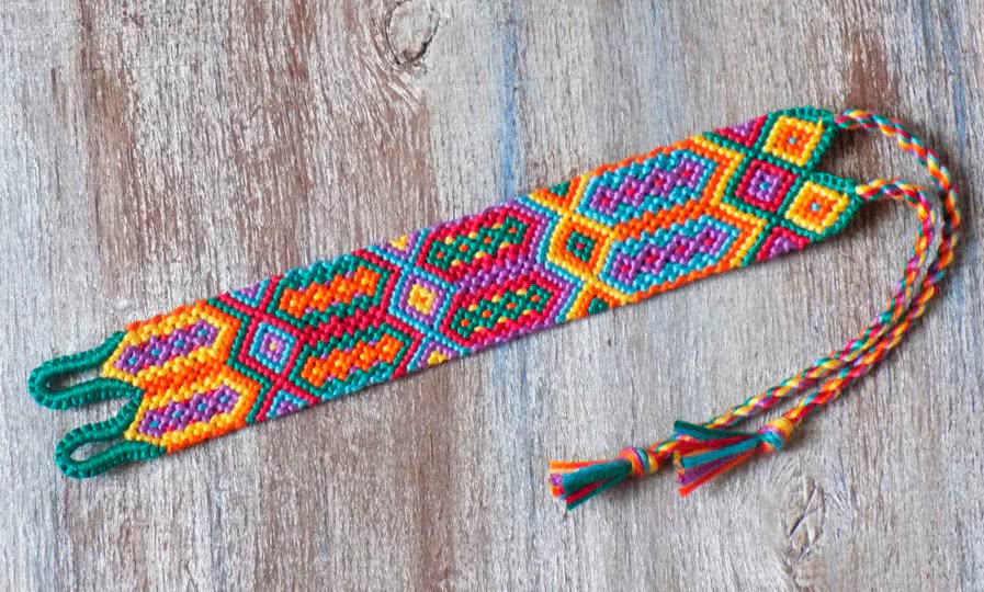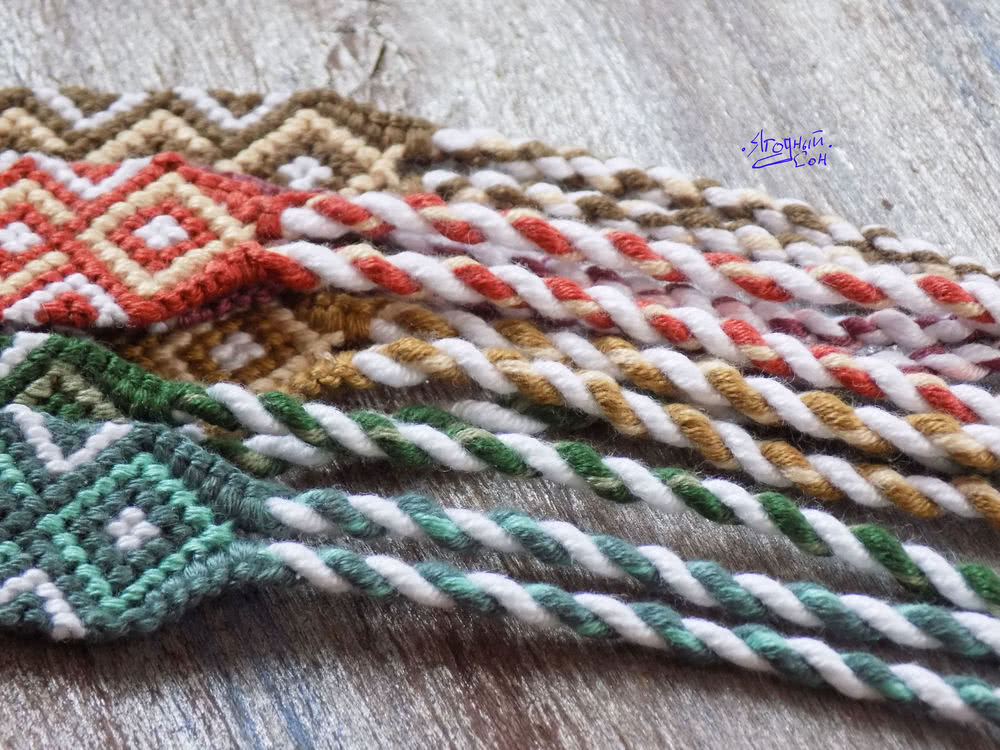 По внешнему виду эти завязки напоминают миниатюрный канат. Плести их очень легко, а результат выглядит очень эстетично благодаря сочетанию разноцветных ниток.