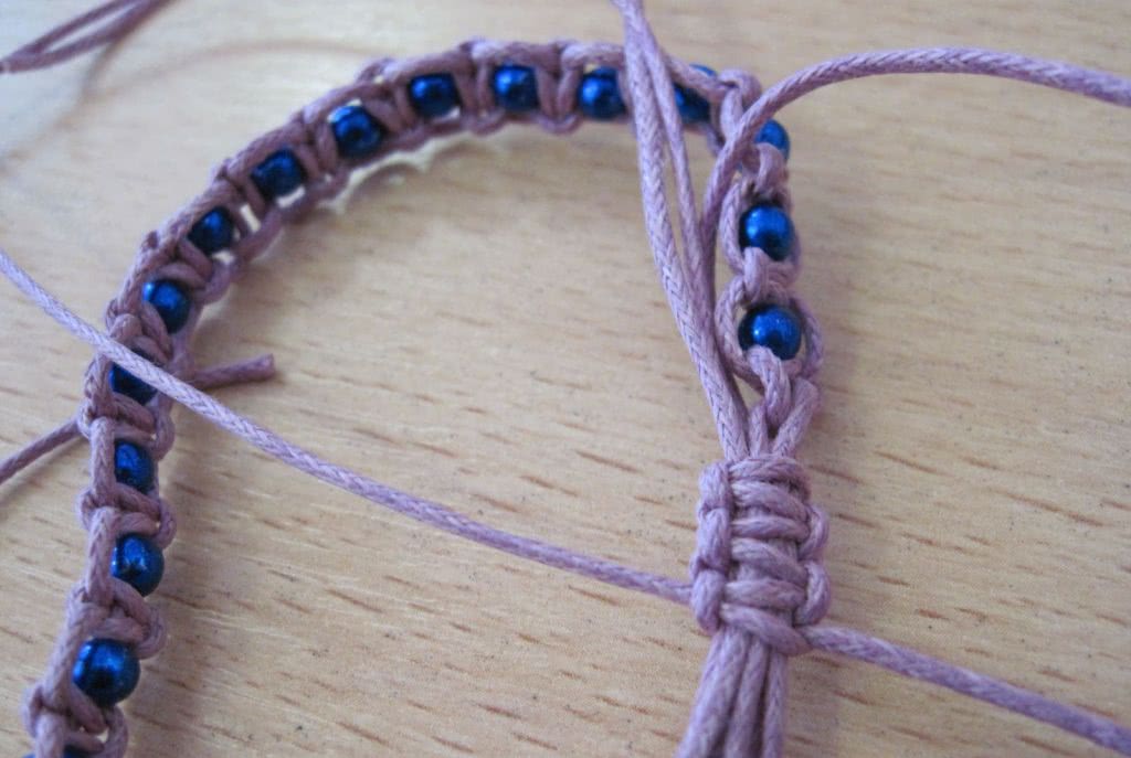 по завершении рисунка проплетаем еще несколько однотонных рядов, заканчивая фенечку.