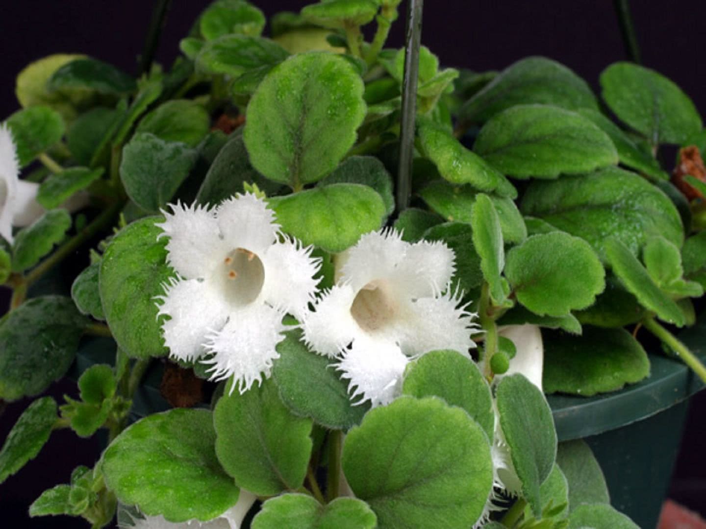 Листья цветка овальные зеленого цвета. На верхней части заметны темные жилки, много ворсинок. Одиночные соцветия похожи на трубочки с бархатным кантом. Чаще их окрас белый либо с красными пятнами. Длина трубки может вырастать до 6 см, в диаметре цветок составляет 2,5 см.