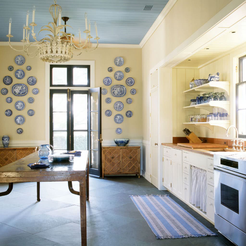 По мнению психологов, голубой потолок на кухне оказывает благотворное воздействие. Он нормализует давление, успокаивает нервную систему, а также снижает аппетит, вызванный стрессом. К тому же такие потолки прекрасно сочетаются с другими цветами и натуральными материалами.
