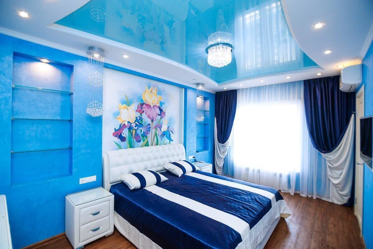 Голубой потолок в спальне обладает успокаивающим эффектом, позволяет расслабиться и быстрее восстановиться после тяжелого рабочего дня. Создать расслабляющую и романтическую атмосферу могут и потолки с необычной фотопечатью или встроенными освещением. К примеру, можно использовать голубую подсветку потолка, а также оригинальные светильники, которые имитируют звезды.