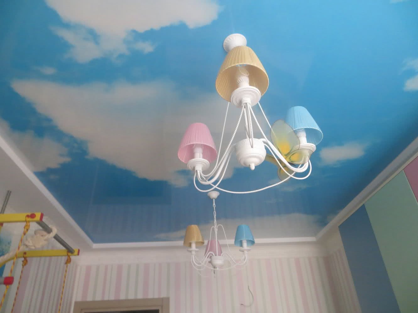 Если комната достаточно просторна и наполнена светом, можно выбрать в качестве оформления потолка и вечернее небо, однако подбирайте подходящий вариант с осторожностью. Атмосфера в этом помещении не должна вызывать сонливость. В комнате для детей можно использовать сказочную тематику (такой вариант уместен в том случае, если ребенок еще маленький)