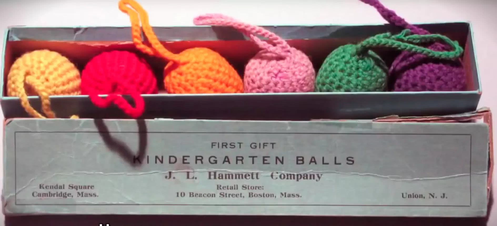 Для развития ребёнка в самом раннем возрасте Фребель предложил шесть «даров». Первым даром является мяч. Мячи должны быть небольшие, мягкие, связанные из шерсти, окрашенные в различные цвета — красный, оранжевый, жёлтый, зелёный, синий, фиолетовый (то есть цвета радуги) и белый. Каждый мяч-шар — на ниточке. Мать показывает ребёнку мячи различного цвета, развивая таким образом его умение различать цвета. Раскачивая шарик в разные стороны и соответственно приговаривая «вперед-назад», «вверх-вниз», «вправо-влево», мать знакомит ребёнка с пространственными представлениями. Показывая шарик на ладони и пряча его, приговаривая при этом «Есть мячик — нет мячика», она знакомит ребёнка с утверждением и отрицанием.