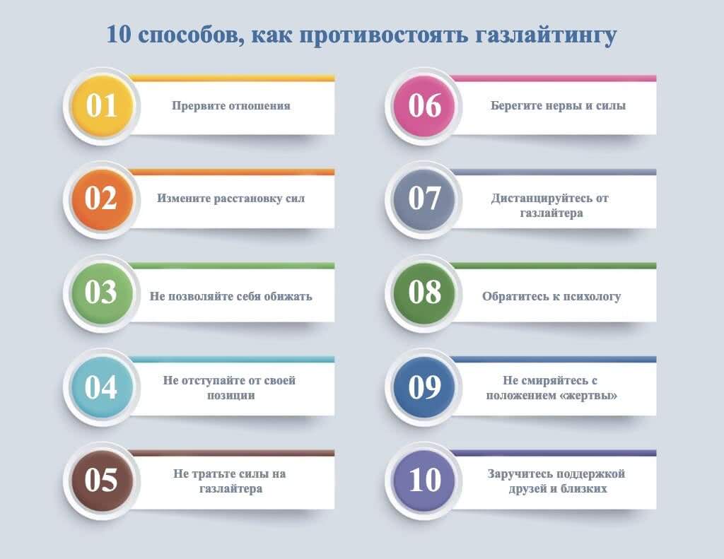 8. Лучшим решением вопроса, как противостоять газлайтеру в семье, будет консультация психолога. Для этого необходимо сделать первый шаг — признать то, что вы стали жертвой в отношениях. Психологи помогут разобраться в сомнениях, страхах и тревогах, научат навыкам осознания, контроля и посоветуют, как общаться с газлайтером.