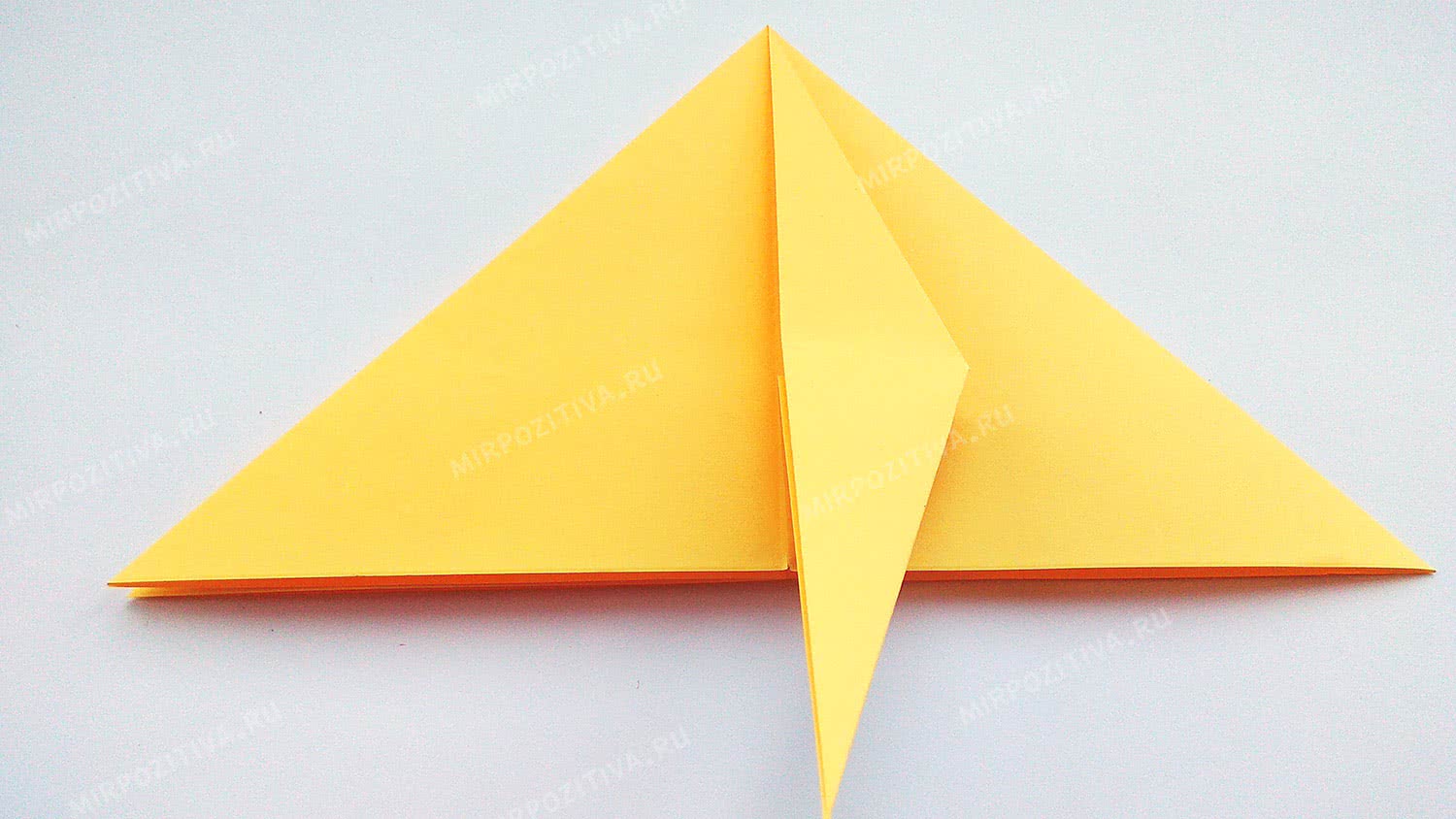 Шаг 10. Согните треугольник пополам так, чтобы выделенные острые уголки остались снаружи, и можно опустить их вниз.
