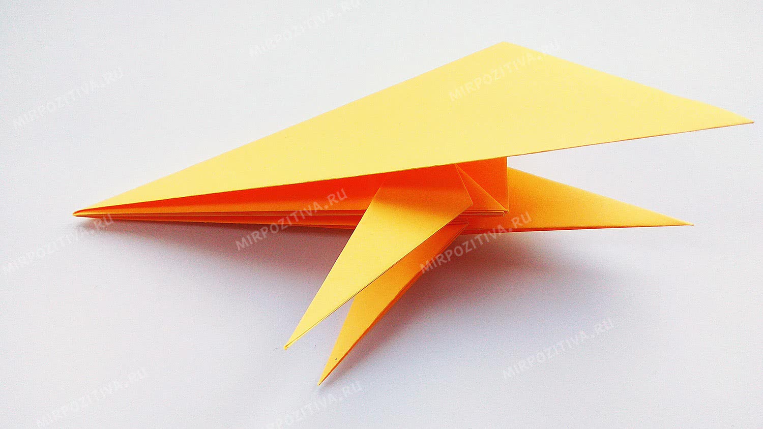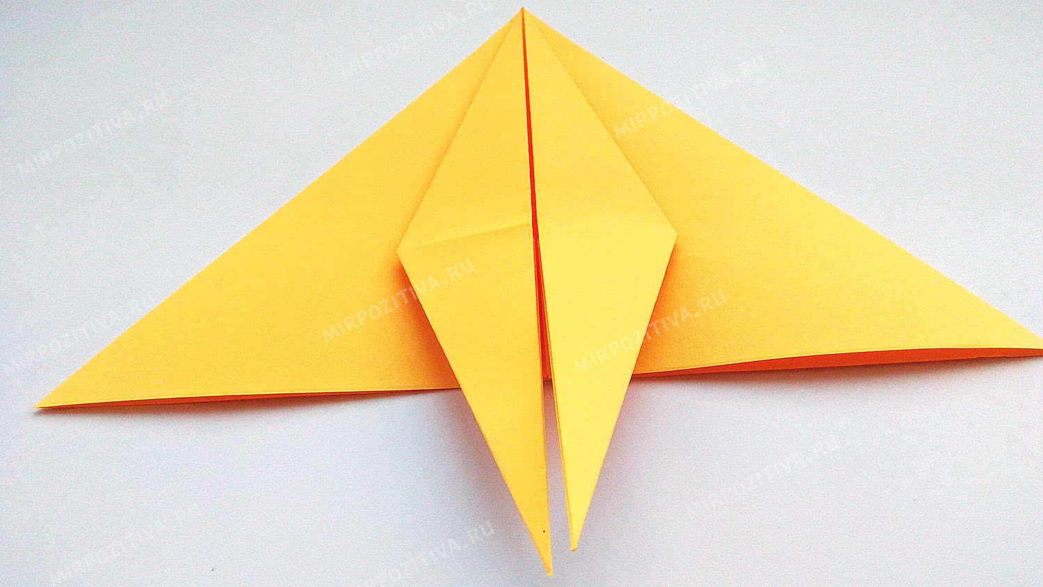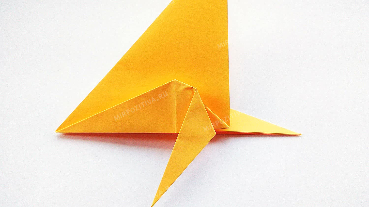 - Загните верхнюю часть (это будет хвост) вправо, вдоль линии крыла.