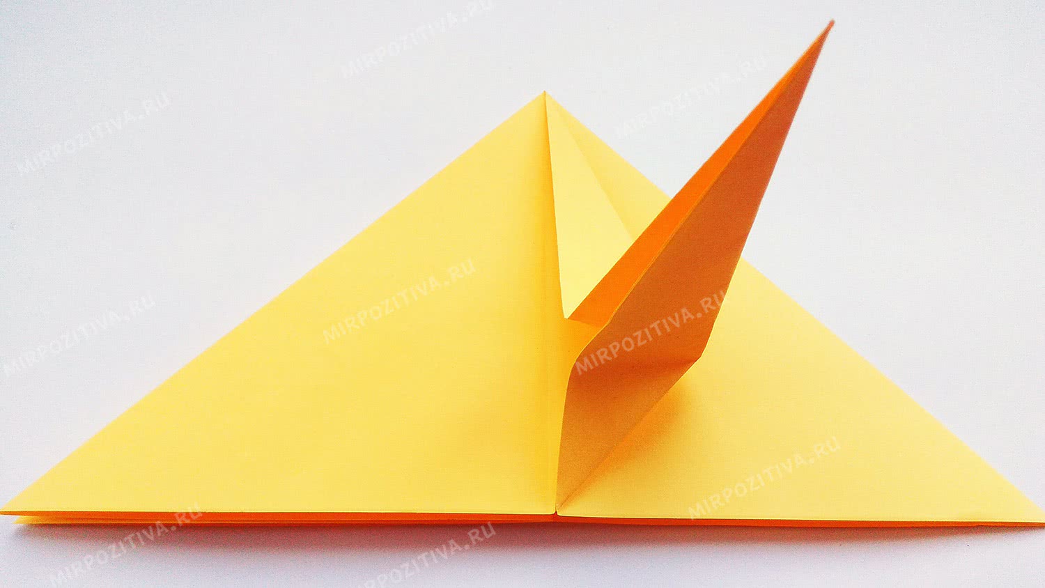 Шаг 17. Эти острые уголки впоследствии станут ногами птицы, 2 выступа, которые смотрят в обратную сторону, станут крыльями, а переднюю цельную часть нужно превратить в шею и голову. Для начала под некоторым углом согните, стараясь разгладить бумагу.