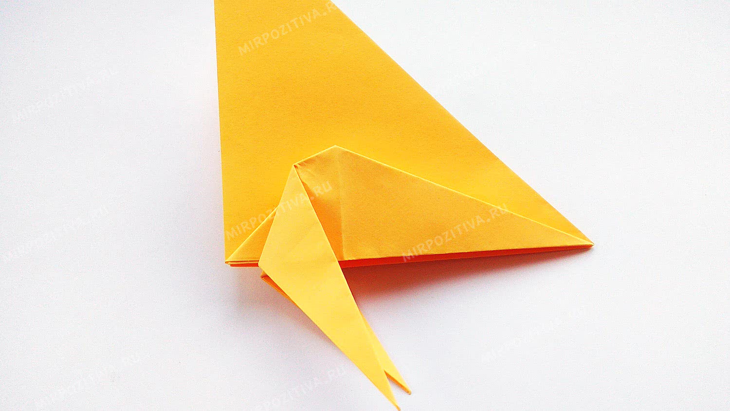 - Теперь перегните угол вниз и внутрь. Получится голова.