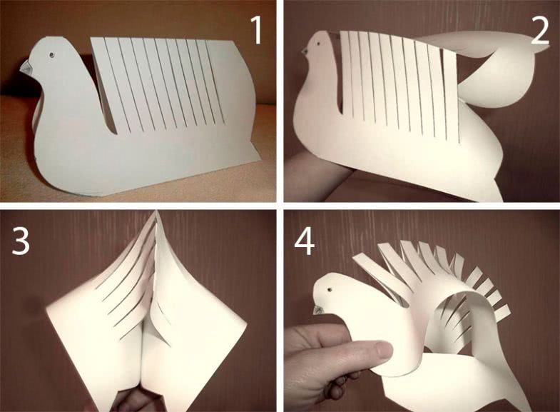 Такую поделку будет под силу сделать детям младшей группы детского сада. Для изготовления потребуется белая бумага, ножницы, бумажные салфетки или папиросная бумага, картон и карандаш. Создание объемного голубя поэтапно: