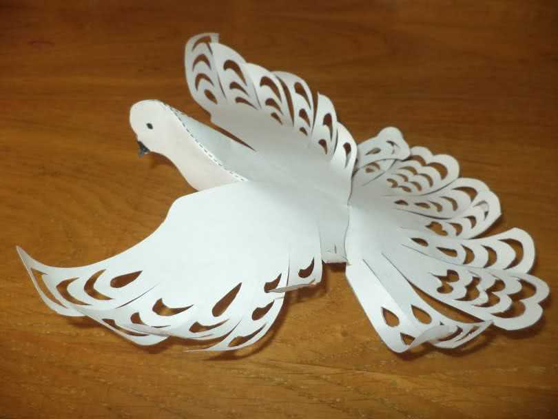 На этом завершается сборка голубя из бумаги по трафарету-шаблону. Для вырезания следует найти хорошую бумагу, чтобы получился лучший результат. Самодельный голубь принесёт в жизнь владельца мир, порядок и удачу в семейную жизнь.